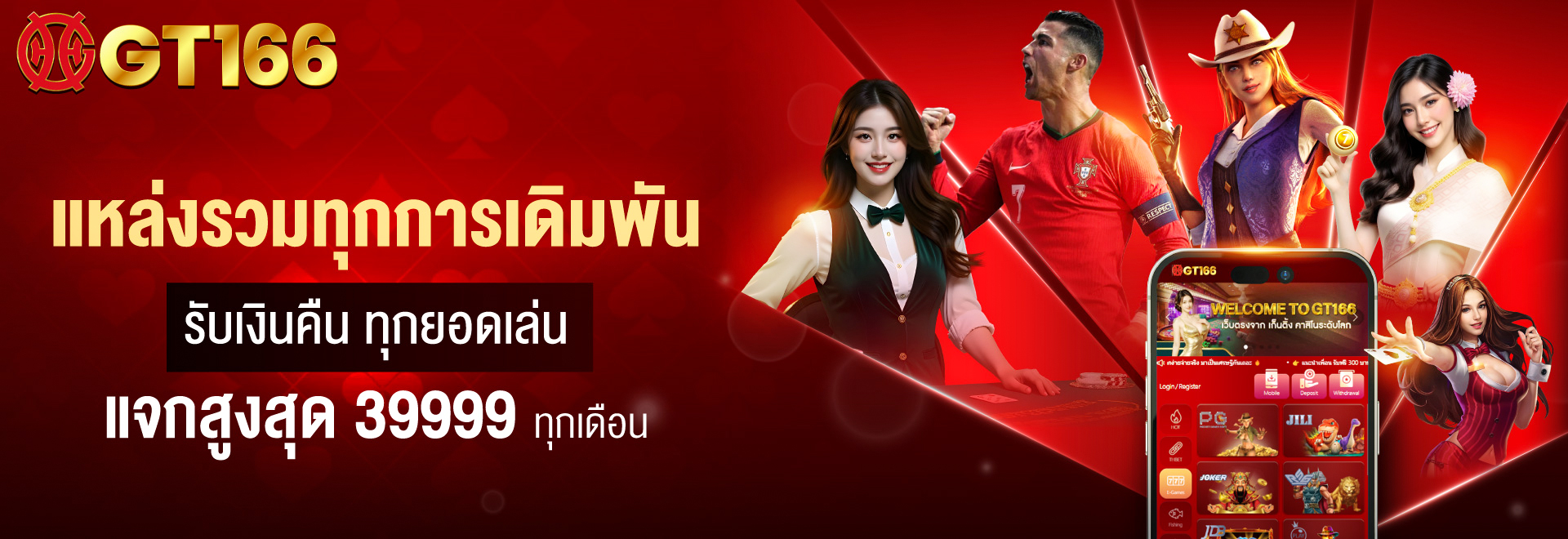 GT166 ศูนย์รวมเกมพนันออนไลน์ครบวงจร ให้บริการตลอด 24 ชั่วโมง รองรับการเล่นทั้งบนมือถือและคอมพิวเตอร์ ด้วยระบบฝาก-ถอนอัตโนมัติที่รวดเร็วภายใน 30 วินาที ไม่มีขั้นต่ำในการเดิมพัน เริ่มต้นเพียง 1 บาท